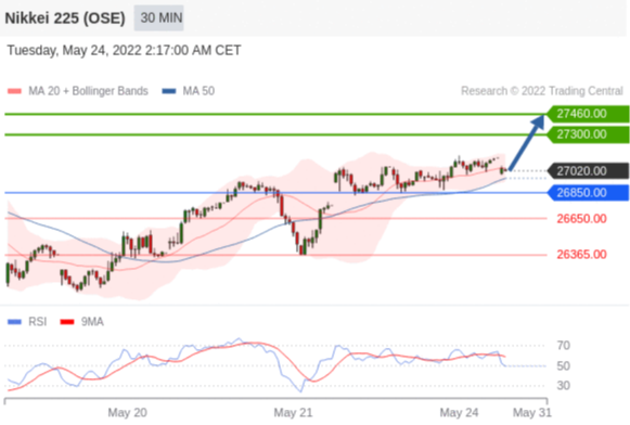 日经225股指期货 (OSE) (M2) 当日内交易策略: 在 26850.00 之上 目标价位为 27300.00 (20220524)