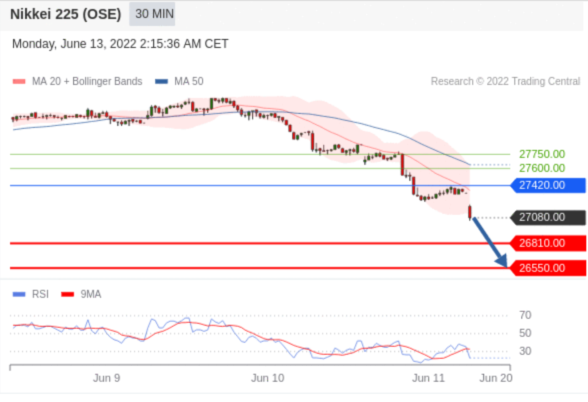 交易策略: 在 27420.00 之下,看跌,目标价位为 26810.00 ,然后为 26550.00 。