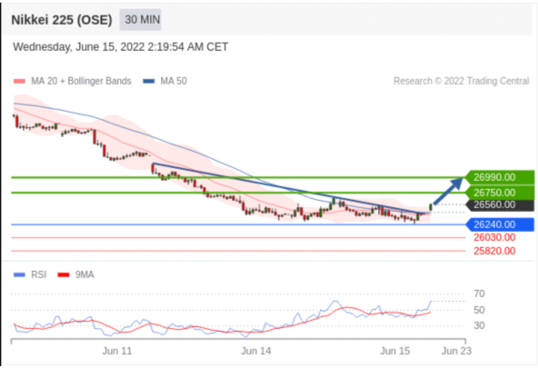 日经225股指期货 (OSE) (U2) 当日内交易策略: 在 26240.00 之上 目标价位为 26750.00 (20220615)