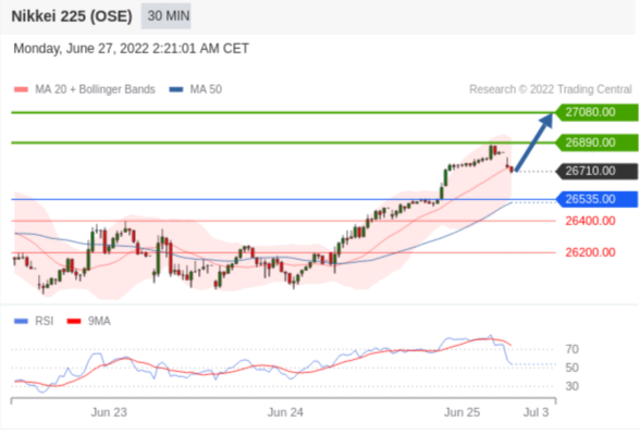 日经225股指期货 (OSE) (U2) 当日内交易策略: 在 26535.00 之上 目标价位为 26890.00(20220627)