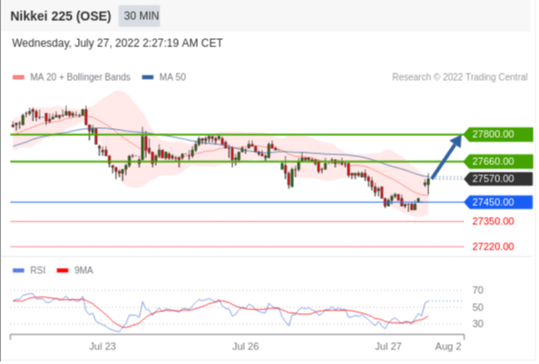 交易策略: 在 27450.00 之上,看涨,目标价位为 27660.00 ,然后为 27800.00 。