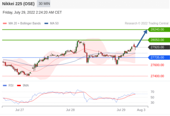 日经225股指期货 (OSE) (U2) 当日内交易策略: 在 27735.00 之上 目标价位为 28050.00(20220729)