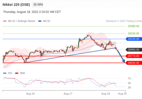 交易策略: 在 29120.00 之下,看跌,目标价位为 28770.00 ,然后为 28630.00 。