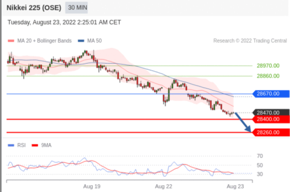 日经225股指期货 (OSE) (U2) 当日内交易策略: 在 28670.00 之下 目标价位为 28400.00(20220823)