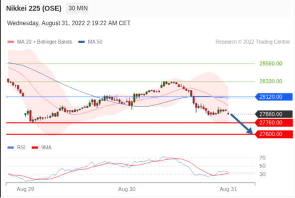 交易策略: 在 28120.00 之下,看跌,目标价位为 27760.00 ,然后为 27600.00 。