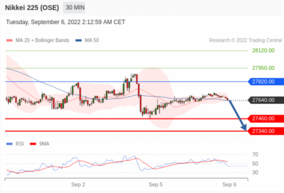 交易策略: 在 27820.00 之下,看跌,目标价位为 27460.00 ,然后为 27340.00 。