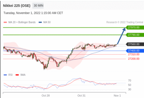 交易策略: 在 27400.00 之上,看涨,目标价位为 27790.00 ,然后为 27970.00 。
