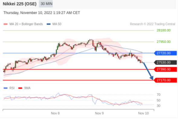 交易策略: 在 27720.00 之下,看跌,目标价位为 27390.00 ,然后为 27170.00 。