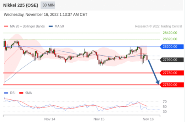 日经225股指期货 (OSE) (Z2) 当日内交易策略: 在 28200.00 之下 目标价位为 27780.00(20221116)
