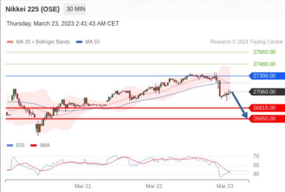 日经225股指期货 (OSE) (M3) 当日内交易策略: 在 27300.00 之下 目标价位为 26815.00(20230323)