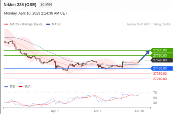 日经225股指期货 (OSE) (M3) 当日内交易策略: 在 27480.00 之上 目标价位为 27780.00(20230410)