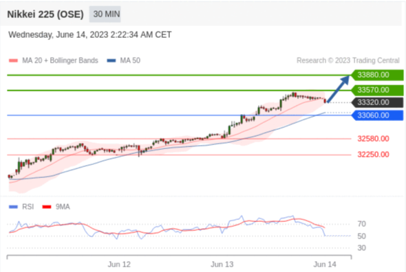 日经225股指期货 (OSE) (U3) 当日内交易策略: 在 33060.00 之上 目标价位为 33570.00 (20230614)