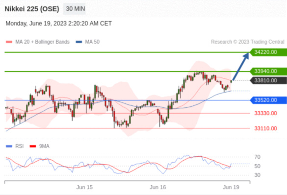 交易策略: 在 33520.00 之上,看涨,目标价位为 33940.00 ,然后为 34220.00 。