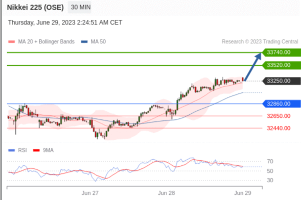 在 32860.00 之上,看涨,目标价位为 33520.00 ,然后为 33740.00 。