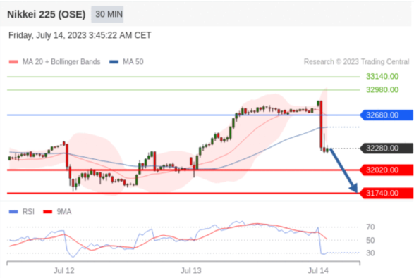 日经225股指期货 (OSE) (U3) 当日内交易策略: 在 32680.00 之下 目标价位为 32020.00(20230714)