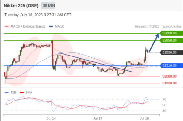日经225股指期货 (OSE) (U3) 当日内交易策略: 在 32310.00 之上 目标价位为 32850.00 (20230718)
