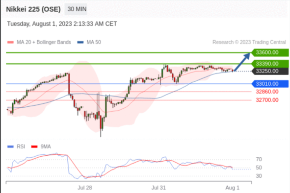 日经225股指期货 (OSE) (U3) 当日内交易策略: 在 33010.00 之上 目标价位为 33390.00(20230801)
