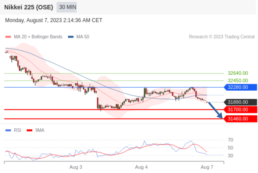 日经225股指期货 (OSE) (U3) 当日内交易策略: 在 32280.00 之下 目标价位为 31700.00(20230807)