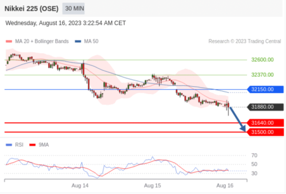 日经225股指期货 (OSE) (U3) 当日内交易策略: 在 32150.00 之下 目标价位为 31640.00(20230816)