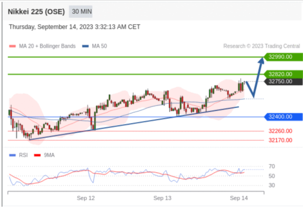 日经225股指期货 (OSE) (U3) 当日内交易策略: 在 32400.00 之上 目标价位为 32820.00 (20230914)