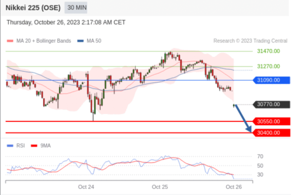 日经225股指期货 (OSE) 当日内交易策略: 在 31090.00 之下 目标价位为 30550.00(20231026)