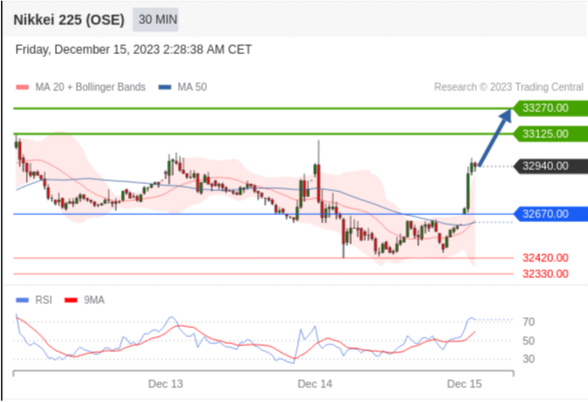 日经225股指期货 (OSE) 当日内交易策略: 在 32670.00 之上 目标价位为 33125.00(20231215)