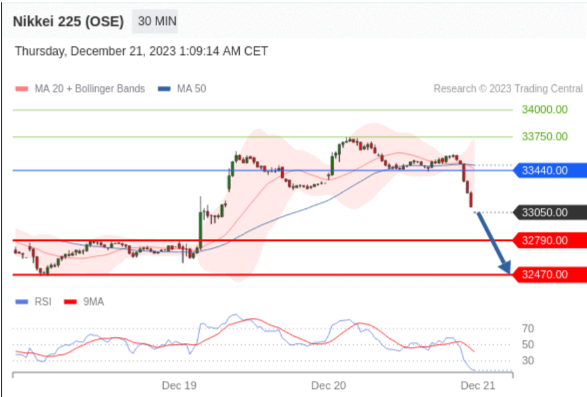 日经225股指期货 (OSE) 当日内交易策略: 在 33440.00 之下 目标价位为 32790.00 (20231221)