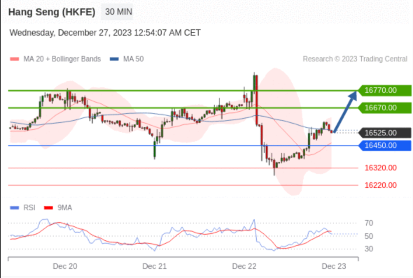 香港恒生指数期货 (Z3) 当日内交易策略: 在 16450.00 之上 目标价位为 16670.00(20231227)