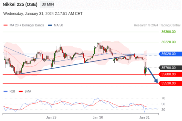 日经225股指期货 (OSE) 当日内交易策略: 在 36020.00 之下 目标价位为 35680.00(20240131)