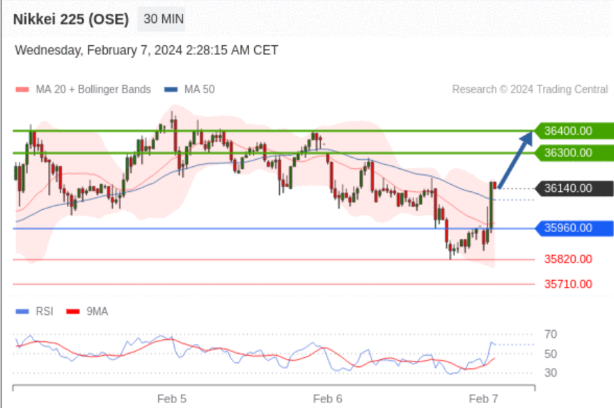 日经225股指期货 (OSE) 当日内交易策略: 在 35960.00 之上 目标价位为 36300.00(20240207)