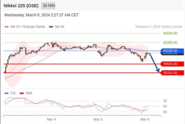 日经225股指期货 (OSE) 当日内交易策略: 在 40030.00 之下 目标价位为 39600.0(20240306)