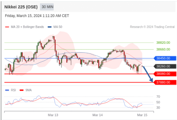 日经225股指期货 (OSE) 当日内交易策略: 在 38450.00 之下 目标价位为 38080.00(20240315)