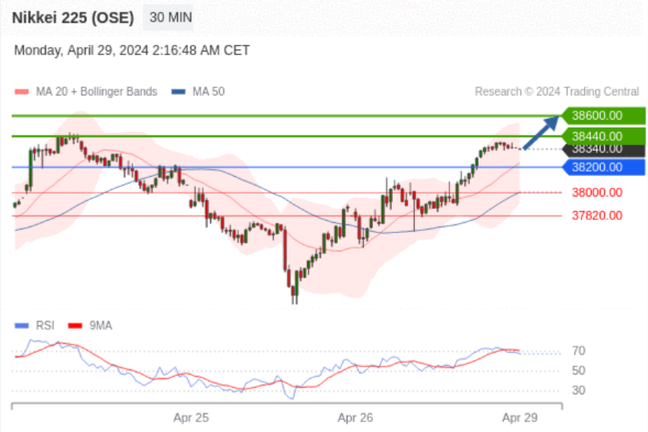 交易策略: 在 38200.00 之上,看涨,目标价位为 38470.00 ,然后为 38600.00 。