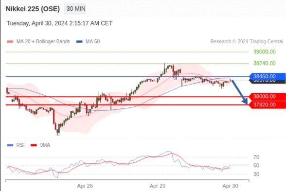 交易策略: 在 38450.00 之下,看跌,目标价位为 38000.00 ,然后为 37820.00 。