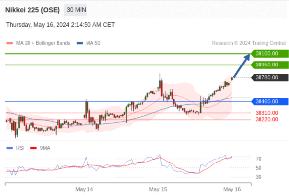 日经225股指期货 (OSE) 当日内交易策略: 在 38460.00 之上 目标价位为 38950.00 (20240516)
