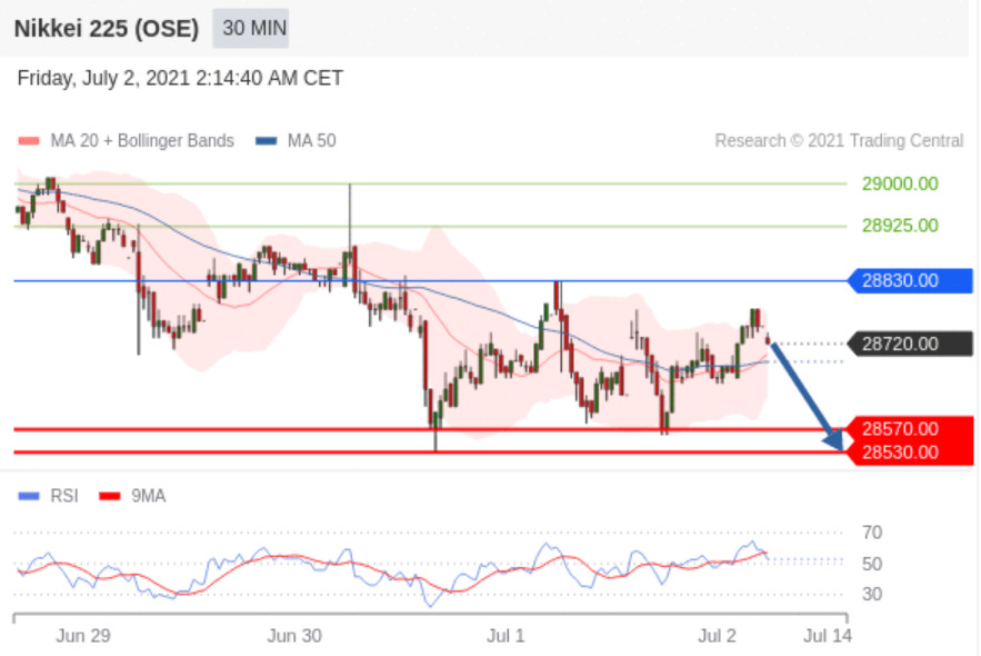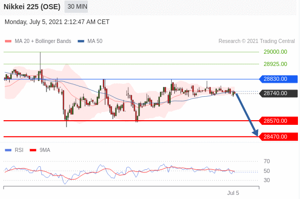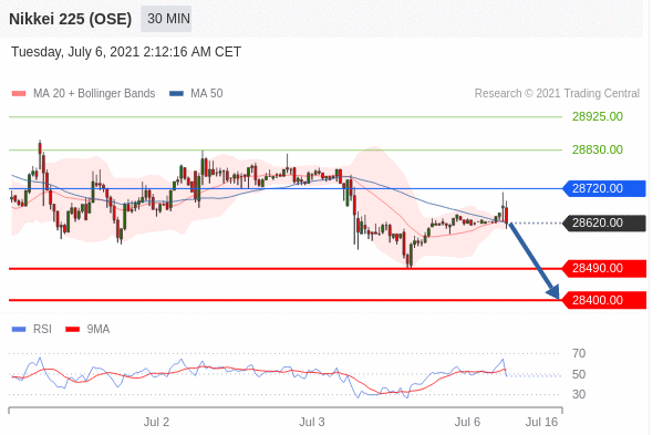 在28720.00之下,看跌,目标价位为28490.00,然后为28400.00。 转折点:28720.00 交易策略:在28720.00之下,看跌,目标价位为28490.00,然后为28400.00。 备选策略:在28720.00上,看涨,目标价位定在28830.00,然后为28925.00。 技术点评:上升的空间可能被28720.00阻力位所限制。 阻力位: 28925.00 28830.00 28720.00 支
