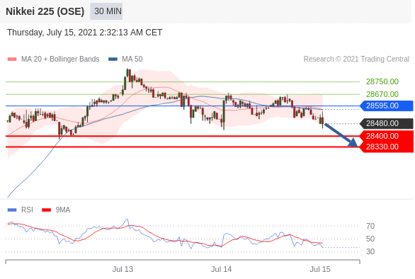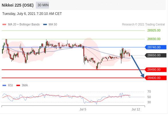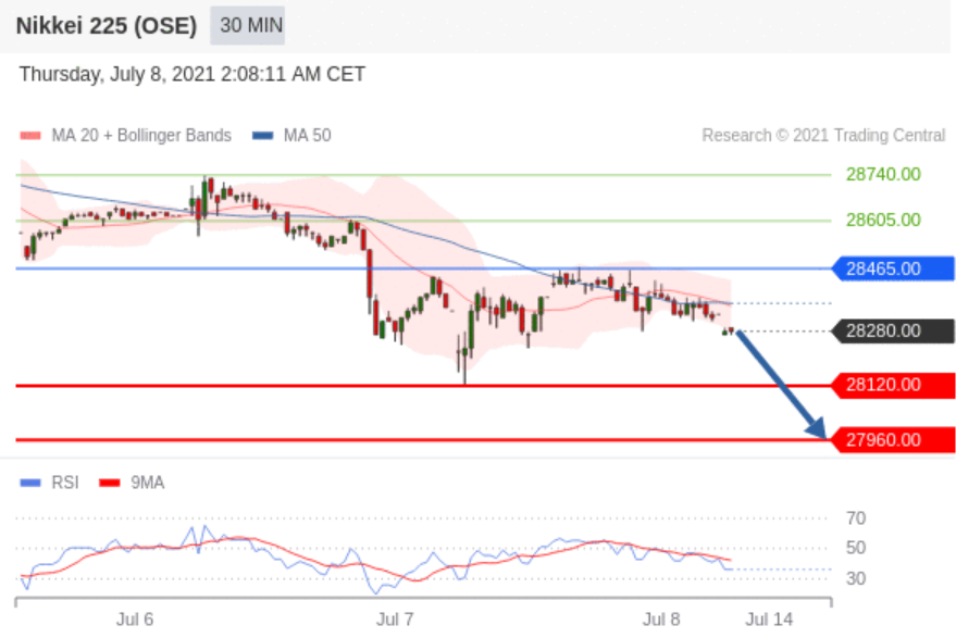 日经225股指期货(O)(U1)当日内:短期关键阻力位在28740.00。 在28740.00之下,看跌,目标价位为28490.00,然后为28400.00。 转折点:28740.00 交易策略:在28740.00之下,看跌,目标价位为28490.00,然后为28400.00。 备选策略:在28740.00上,看涨,目标价位定在28830.00,然后为28925.00。 技术点评:只要28740.00阻力位不