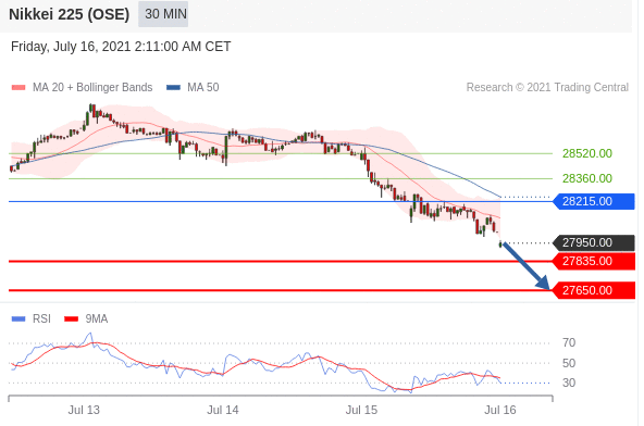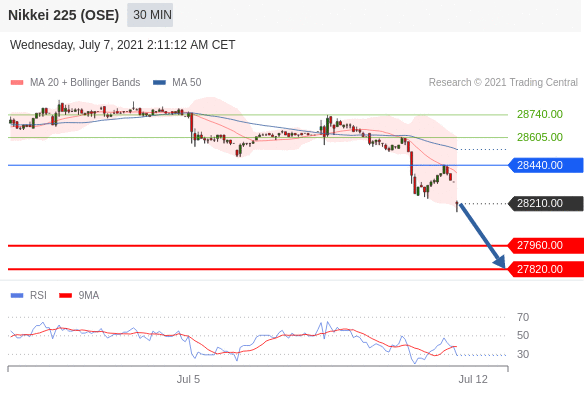 在28215.00之下,看跌,目标价位为27835.00,然后为27560.00。 转折点:28215.00 交易策略:在28215.00之下,看跌,目标价位为27835.00,然后为27560.00。 备选策略:在28215.00上,看涨,目标价位定在28360.00,然后为28520.00。 技术点评:跌破27835.00位置,将会引发下跌至27560.00。 阻力位: 28520.00 28360.00 28215.0