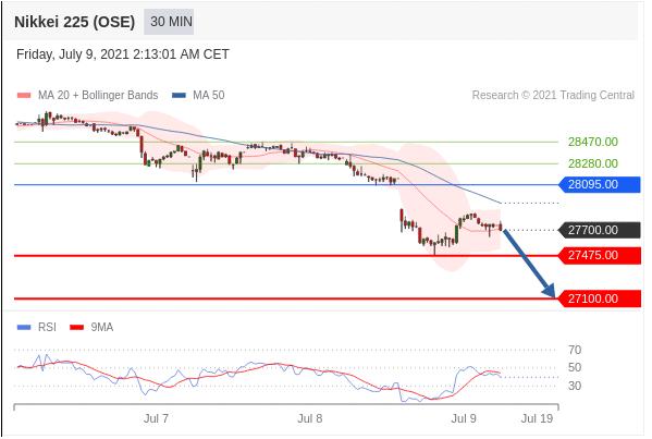 在28095.00之下,看跌,目标价位为27475.00,然后为27100.00。 转折点:28095.00 交易策略:在28095.00之下,看跌,目标价位为27475.00,然后为27100.00。 备选策略:在28095.00上,看涨,目标价位定在28280.00,然后为28470.00。 技术点评:只要28095.00阻力位不被突破,向下跌破27475.00位置的风险很高。 阻力位: 28470.0