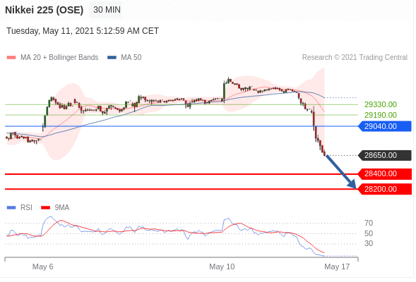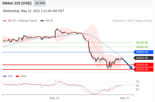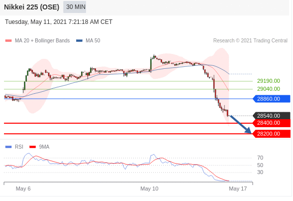 日经225股指期货(O)(1)当日内:短期关键阻力位在28860.00。 在28860.00之下,看跌,目标价位为28420.00,然后为28260.00。 转折点:28860.00 交易策略:在28860.00之下,看跌,目标价位为28420.00,然后为28260.00。 备选策略:在28860.00上,看涨,目标价位定在29040.00,然后为29190.00。 技术点评:指数在现