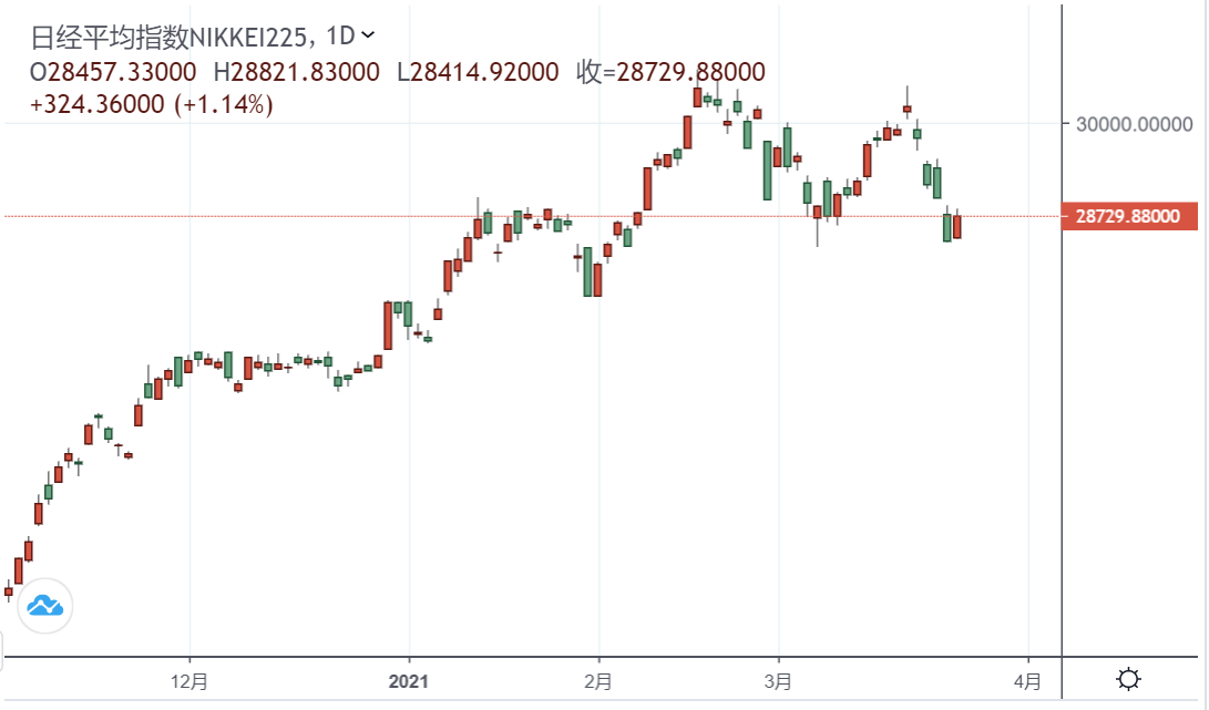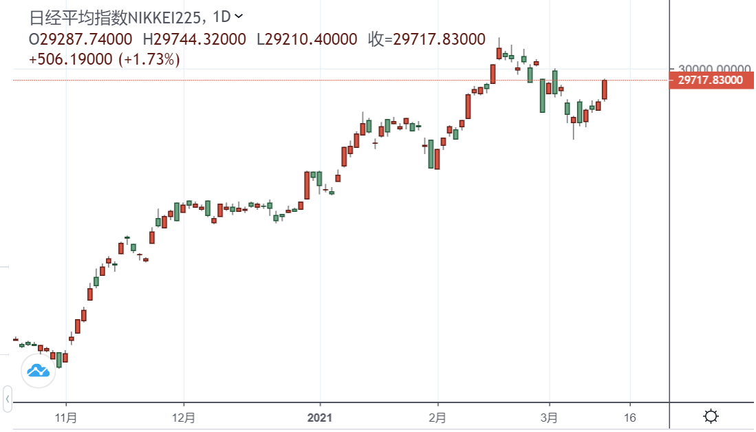 周五,亚太股市多数上涨,日本股市涨超1.7%,芯片和科技股上涨;韩国股市涨超1%,澳洲股市涨约0.8%。拜登签署刺激计划支撑了市场情绪。 日经225指数涨1.73%,收于29717.83点,全周涨2.96%。大部分板块上涨,金属、电器、海运、电子板块领涨。 韩国KOI指数涨1.35%,收于3054.39点,全周涨0.93%。今日绝大部分板块上