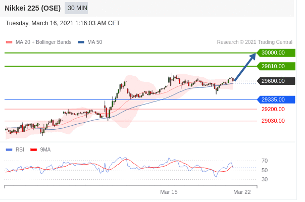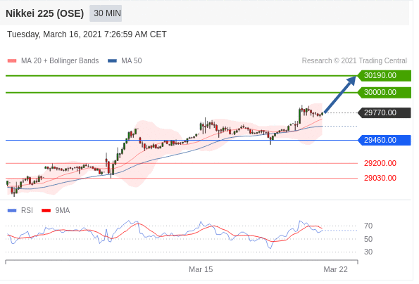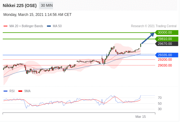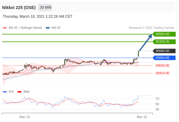 周四,亚太股市普涨,此前美联储宣布维持鸽派政策立场同时上调了美国经济增长目标。日本东证指数自1991年5月以来首次升至2000点上方,创三十年新高。 日经225指数涨1.01%%,收于30126.75点。银行、证券、汽车板块涨幅居前,陆路运输、房地产等少数板块下跌。 据报道,日本央行将在周五会议上把10年期收益率波动区间扩