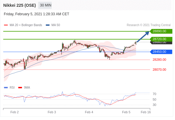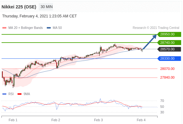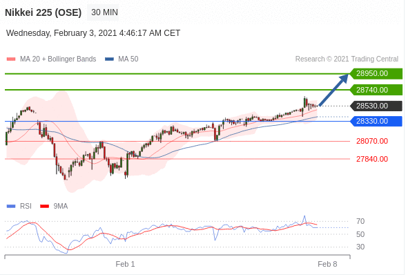 日经225指数已突破今年以来新高,瑞士信贷(Crditui)策略师仍看好其将升向32115/20区域。 核心要点 日经指数已经突破28980/900高点,预期核心上升趋势将会恢复,下一个阻力位将是重要的30000心理关口,最终我们的长期目标是1989年以来跌幅的78.6%斐波那契回撤位32115/20。 如果该指数最终突破32115/20,那么市场可能