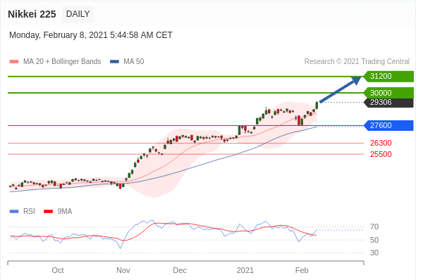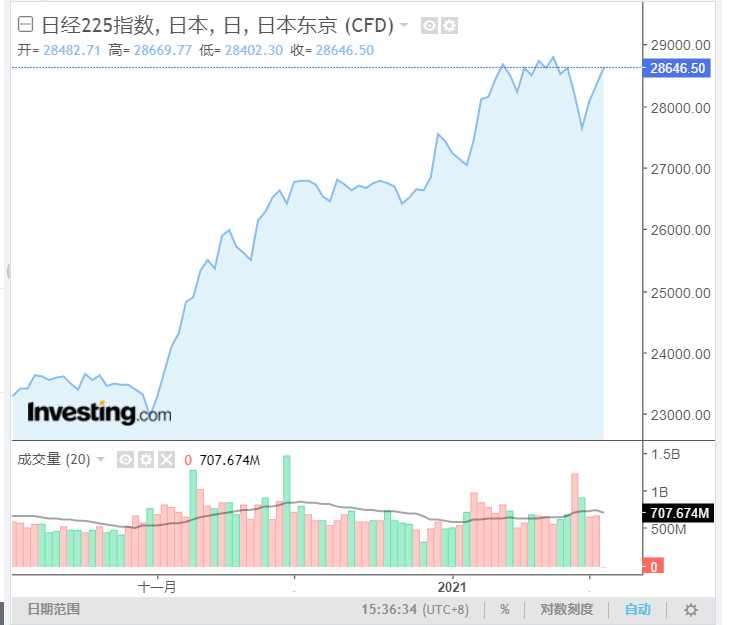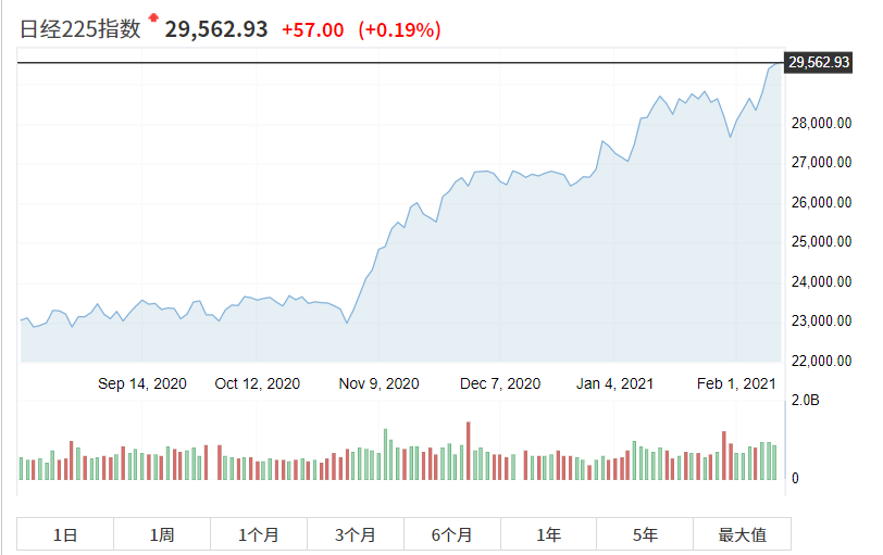 周一,得益于美国新一轮刺激计划出台在望,亚太股市多数上涨,其中印度股市再创历史新高,日本股市续创30年新高。不过,汽车股拖累韩国股市逆市下跌,疫情重创越南股市。 日经225指数涨2.12%,收于29388.50点,再创1991年以来收盘新高。几乎所有板块上涨,日内钢铁、矿业、海运、能源板块领涨。 韩国KOI指数跌0.94%