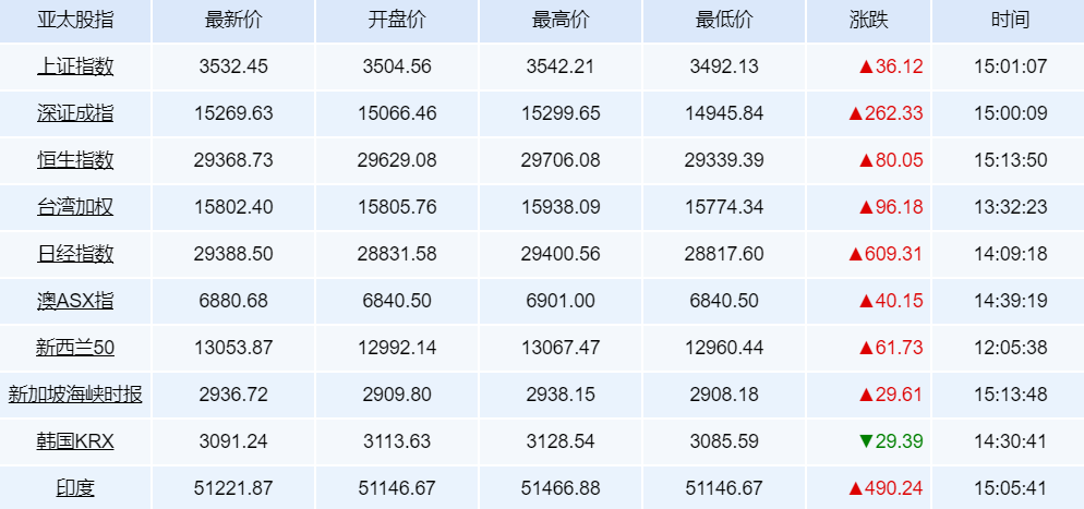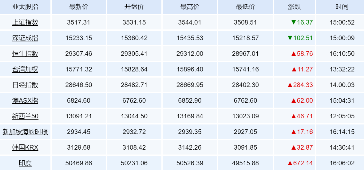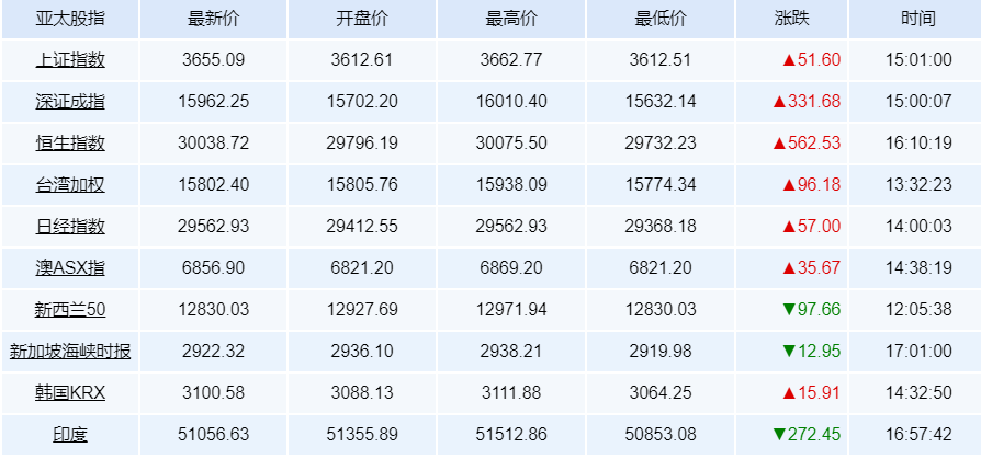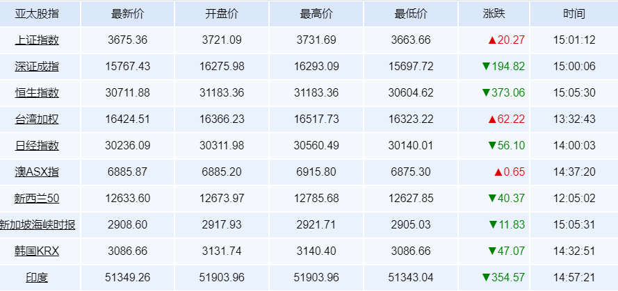 台股:中国台湾加权指数2月18日(周四)收盘上涨62.22点,涨幅0.38%,报16424.51点。 澳股:澳大利亚AX200指数2月18日(周四)收盘上涨0.70点,涨幅0.01%,报6885.90点。 日股:日经225指数2月18日(周四)收盘下跌43.19点,跌幅0.14%,报30249.00点。 韩股:韩国KOI指数2月18日(周四)收盘下跌46.98点,跌幅1.50%,