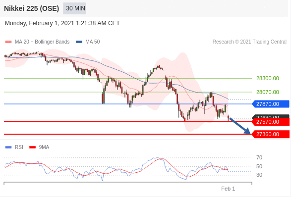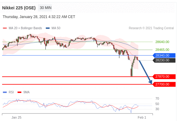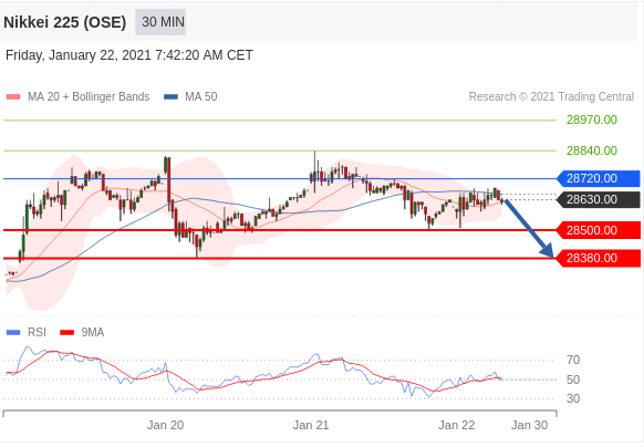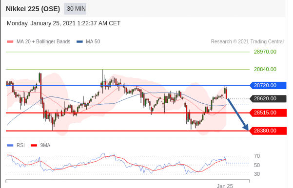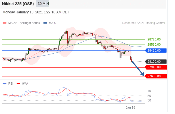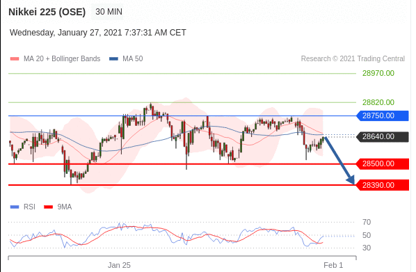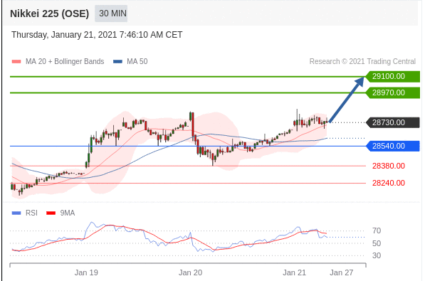 Nikki225当日内:朝28980运行 在28350之上,看涨,目标价位为28800,然后为28980。 转折点:28350 交易策略:在28350之上,看涨,目标价位为28800,然后为28980。 备选策略:在28350下,看空,目标价位定在28110,然后为27900。 技术点评:RI技术指标看涨,有进一步上升空间。 阻力