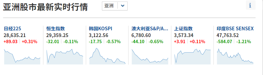 周三,亚太股市多数下跌,受外资卖出拖累,韩国股市小幅收跌,同时矿业股也拖累澳洲股市走低。此外,越南股市跌超3%,菲律宾和印度股市也跌超1%。不过,国际货币基金组织上调全球经济增长预测推升了投资者对日本企业盈利的预期,支撑日本股市小幅上涨。 全球行情信息显示: 日经225指数小幅收涨0.31%,收于28635.21