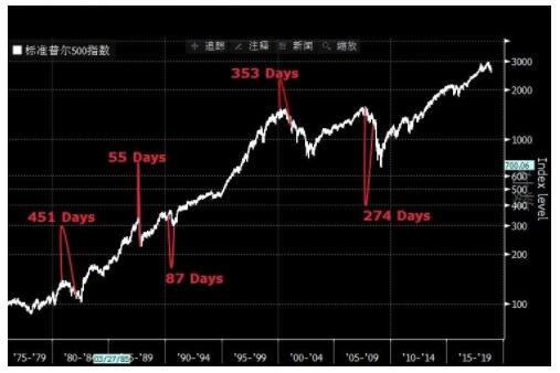 下图是标普500指数走势图。自从二战以来,该指数平均需要262天跌入熊市