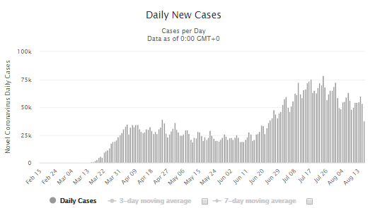 近些日子来,美国新冠病毒新增病例一直居高不下,过去七天平均每天新增病例超过51100例。大学和学校已经开始重新开放,许多学校在大规模的社区传播的背景下开学。在控制病毒方面取得早期成功的国家,如新西兰,现在正努力根除它,并面临着新的、令人困惑的群集感染。8月17日美股收盘,该指数上涨0.3%,至3381.99点,仅比2月19日创下的3386.15点的历史高位低0.1% 。