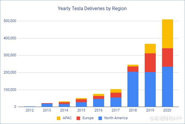 下图显示了各地区特斯拉的年度交付量,同时包括Troy Teslike对第三季度和第四季度交付量的估计。Troy Teslike认为,今年亚太地区的交付量因为本地生产的原因会有很大的增长。